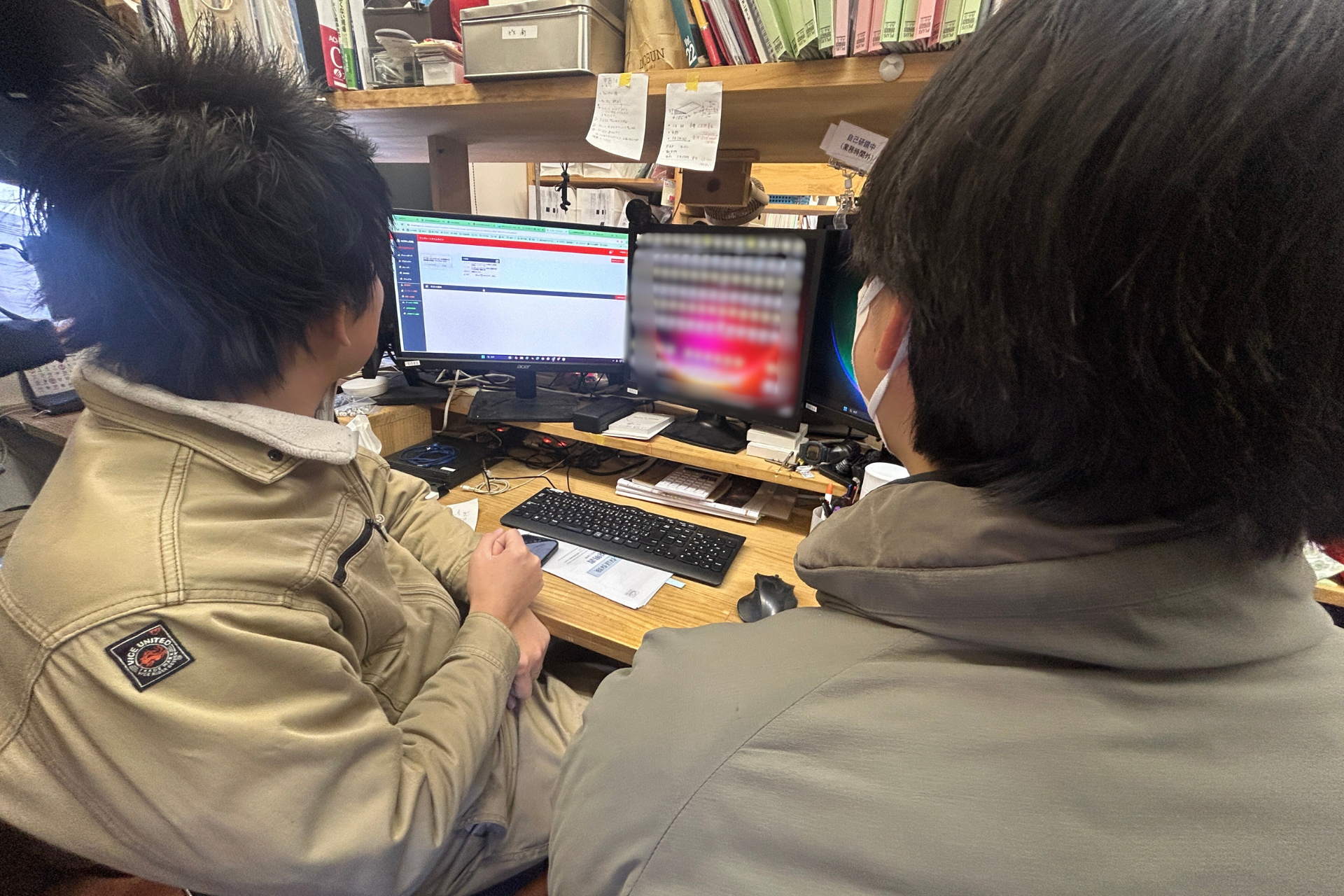 自席でBOXJOBを活用しながら業務フローを見直す幸岡さんとチームメンバー